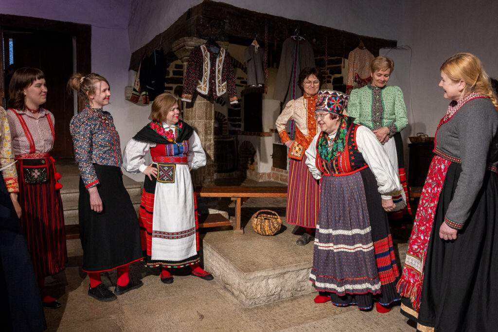 Sõrve ja Saaremaa naised. Tüdrukud-neiud ning rida varemsündind emasid-vanaemasid. Emakeeleks sõrve keel, kel pole, see õpib. Meie kirg on regilaulud ja kõik, mis sinna külge kuulub: jutud ning naistetööd, rahvariided ja põllutarkused, lapsepidamiskunts ning peenem näputöö. Muistised laulud ning arusaaja seltskond – naisterahva tugi, kui lained üle pea tikuvad. Varbad mullas, rätik meretuules. Sündind ning iseakand regilauljad.